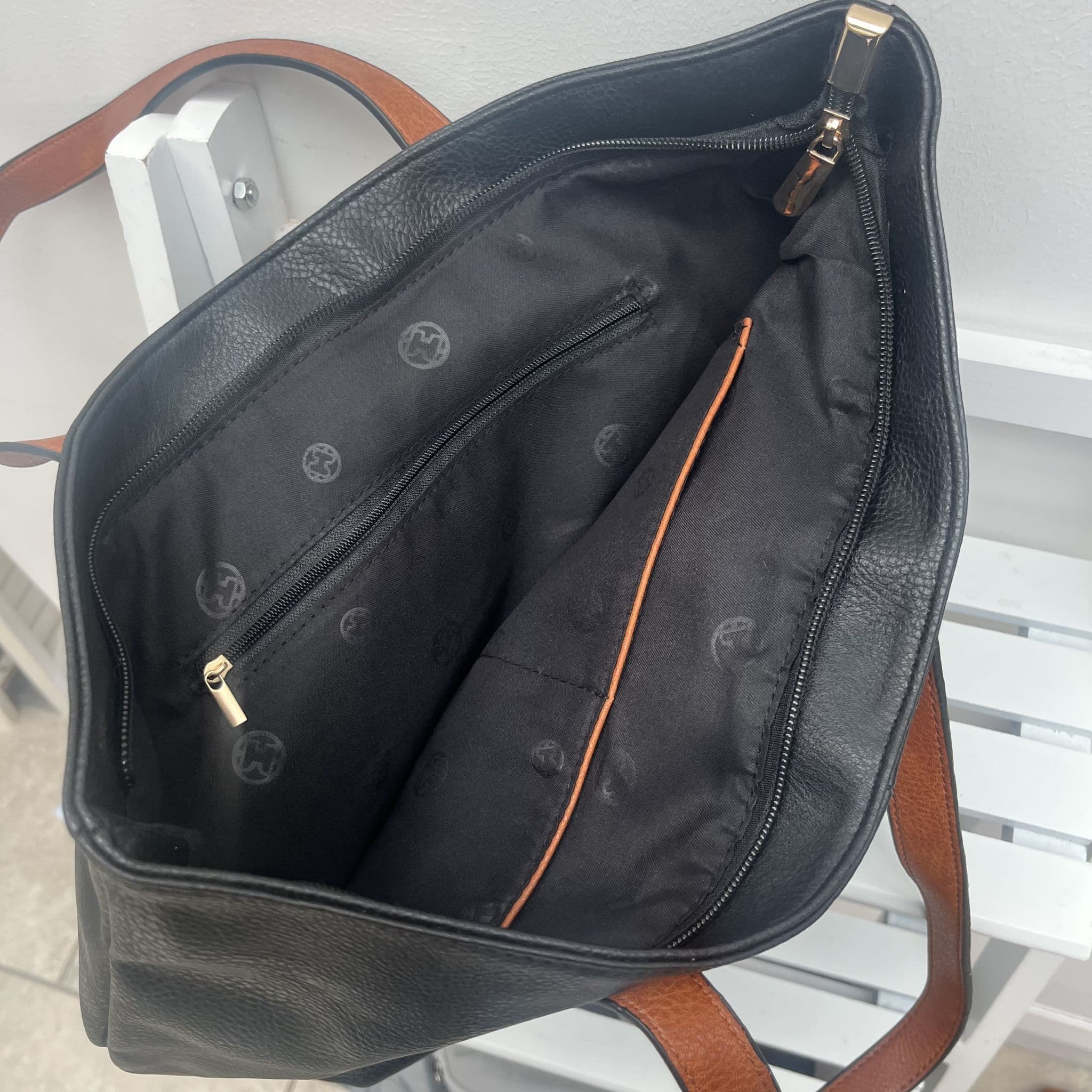 This gorgeous faux leather tote bag has tan faux leather handles. Full zip closure, fully lined with plenty of space inside.