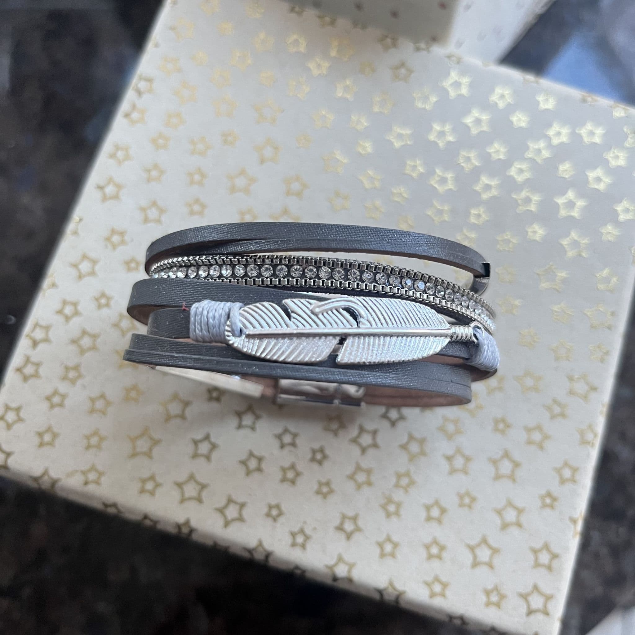 Our gorgeous leather bracelet has faux leather strands with a silver plated feather, diamante and silver plated bars. It attaches easily with silver plated magnetic clasps. The leather bracelet measures approx 7.5" length (standard adult size).